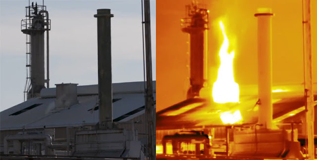 | The DCP Pegasus gas plant in Midkiff, Texas, on Nov. 5, shot with a regular camera (left) and with an infrared camera (right) to reveal methane leaks. (Screenshots from NYT video by Jonah Kessel) |